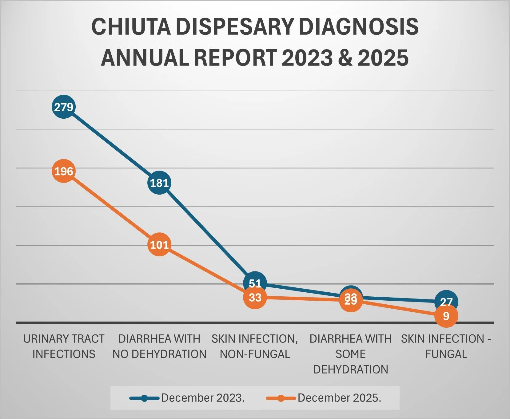 The Graph shows annual report of infection cases of December 2023 before DMDO intervention and December 2025 annual report after DMDO intervention where access to clean and safe water was delivered from April 2024 in Chiuta village including Chiuta Dispensary. Where December 2025 report shows the impact of the DMDO investment on people’s lives.
